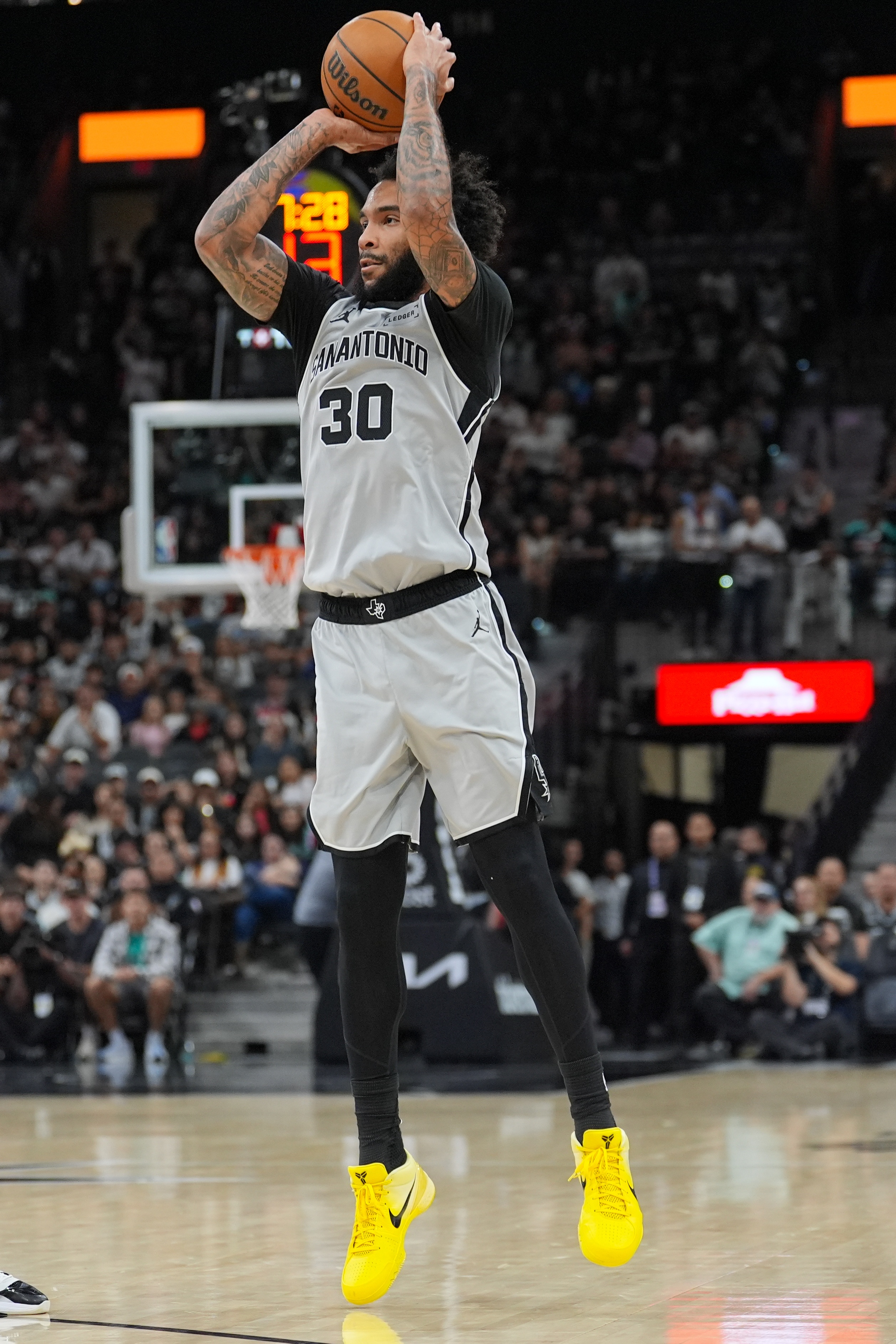 文班亚马降维打击,福克斯快如闪电,尚帕尼刀刀见血,哈珀和凯尔登活力十足,马刺各个点在上半场都拿到了预期的优势。尤其文班亚马的低位威胁和福克斯的突破能力迫使火箭不得不大量回合收缩保护禁区,马刺外线得吃得喝,上半场11记三分万箭穿心。